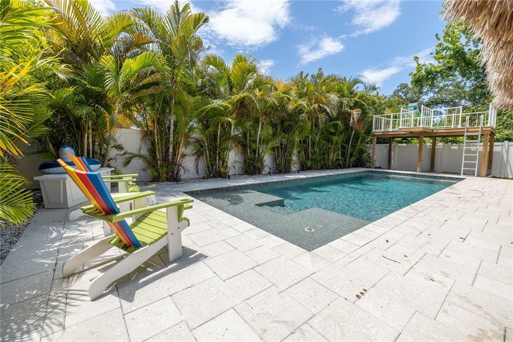 Welcome to your very own tropical paradise located in the desirable neighborhood of Harborview in Seminole. This custom built, elevated, open concept, pool home with high ceilings was built in 2017 by local to Seminole, Chouinard Builders. Have the benefits of being about 1.5 miles to the nearest beach access at Indian Shores but the peace of mind of having an elevated (flood insurance less than $300 a year), newer construction home with hurricane impact windows and a resort style backyard. All premium features and finishes throughout. The open concept kitchen has 42’ inch self closing, shaker cabinets with custom mouldings, a large island, light and bright granite countertops, glass tile back splash, under-mount stainless steel sink and black stainless steel Samsung appliances. You will love the large walk-in pantry and separate inside laundry and storage room off the kitchen. The living and dining space also has crown moulding, is HUGE and perfect for entertaining with some beautiful custom features added in the entryway and a white oak T&G, electric, remote controlled fireplace with mantle and shelving (tv included). Who doesn’t love storage? You have 2 additional closets in the dining space and a large storage closet next to the staircase. You will appreciate the french doors to the back yard and the convenience of having a full bath on the bottom floor with access to the upper deck, tiki bar and lounge and once again, CUSTOM built pool in July of 2018. The pool is a salt water system, surfaced with pebble sheen, with jets and seating on the back, 2 umbrella holes on the sun shelf, surrounded by Shellock pavers that stay much cooler in the hot sun than concrete and mature landscaping to add to your private oasis.